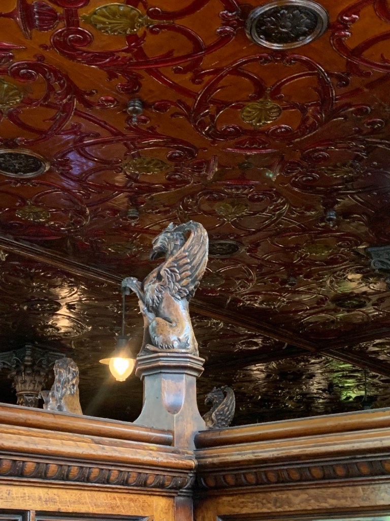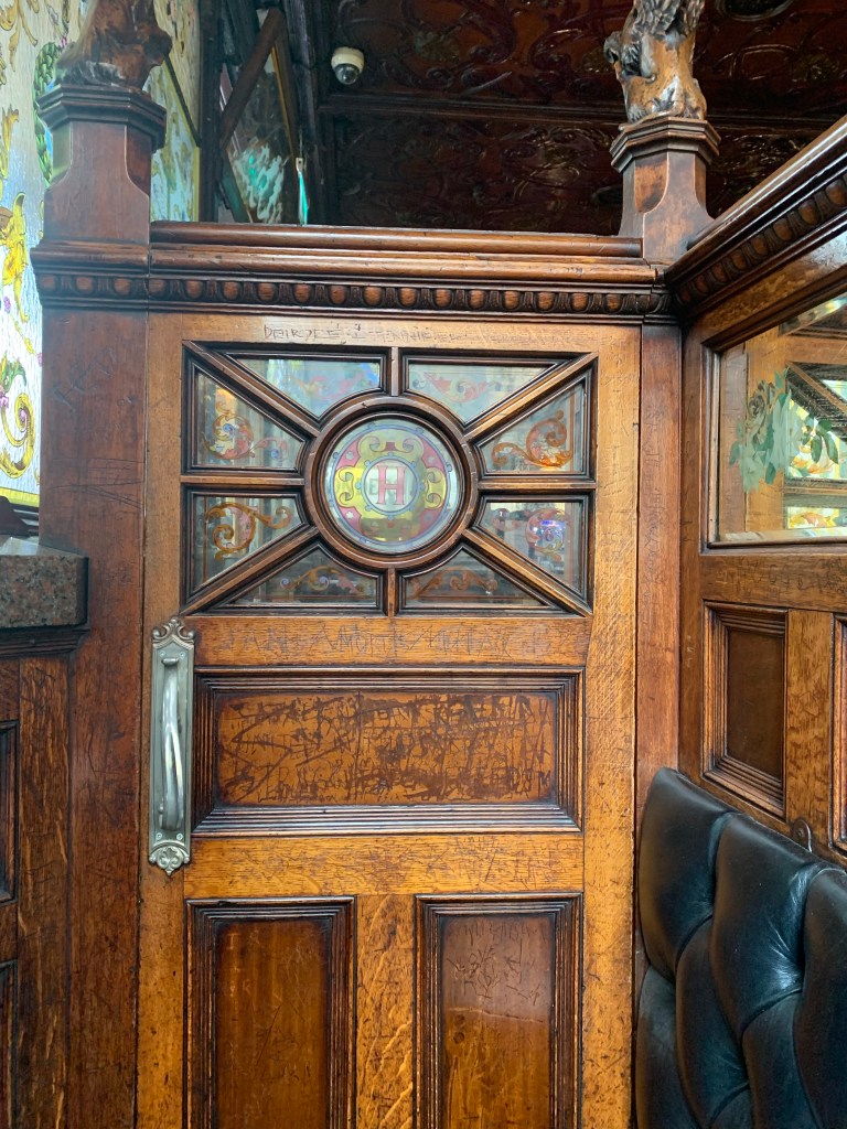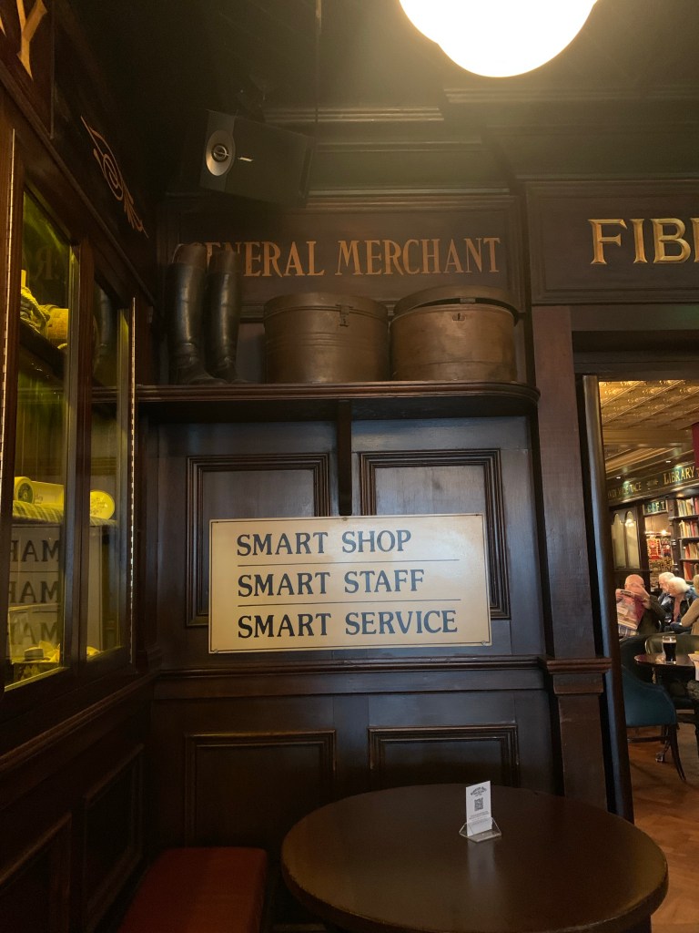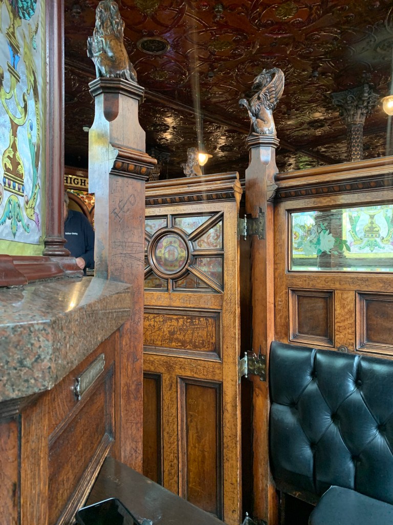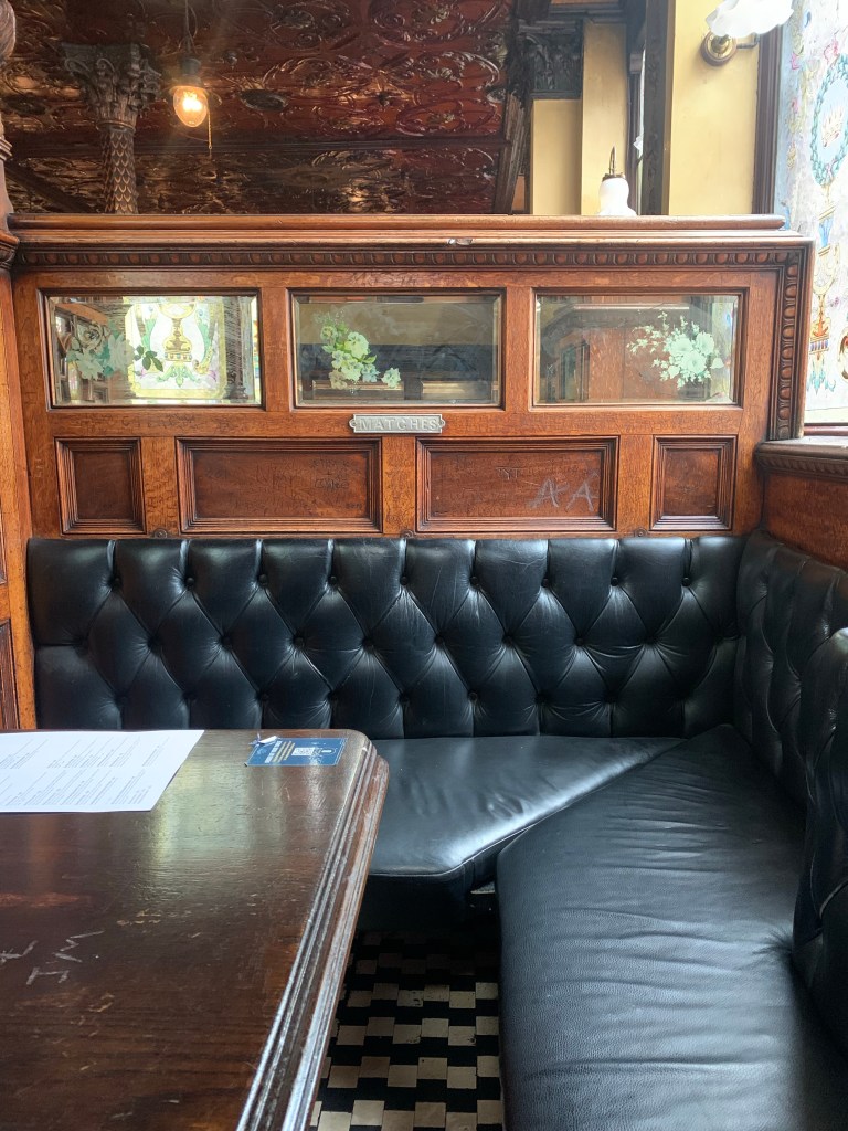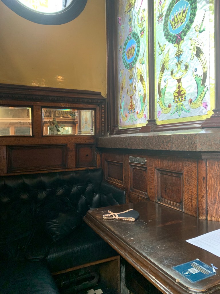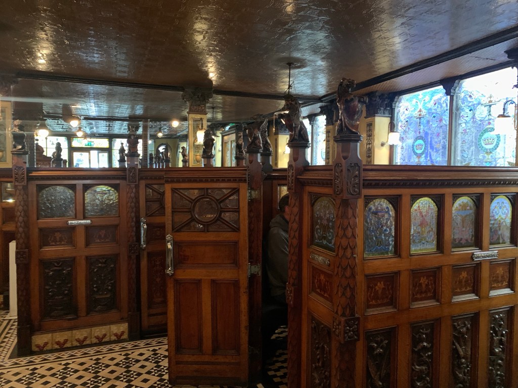 It is decorated in elaborate tiles with stained glass windows on the outside, with carved ceilings, ten wooden booths, or snugs, and original gaslights inside. The snugs were designed for customers who didn’t wish to be seen during their visits in Victorian times. Each snug has a letter, labelled individually from A to J. Each one is equipped with a bell that still works, and would have been used to attract the attention of the staff. There are metal plates on the wooden panelling that would have been used to strike matches. I envisage that, in normal times (pre Covid), this place would be heaving, but it is now practising social distancing rules and it is actually nice to have the space and the booth to yourself!! Nicholson’s own the pub and sells great local ales, whiskies and other spirits. Food is also amazing, with a good choice of sandwiches and hot and cold meals. This place is a must-visit but booking is recommended – I heard the waitresses turning away so many people at the door.