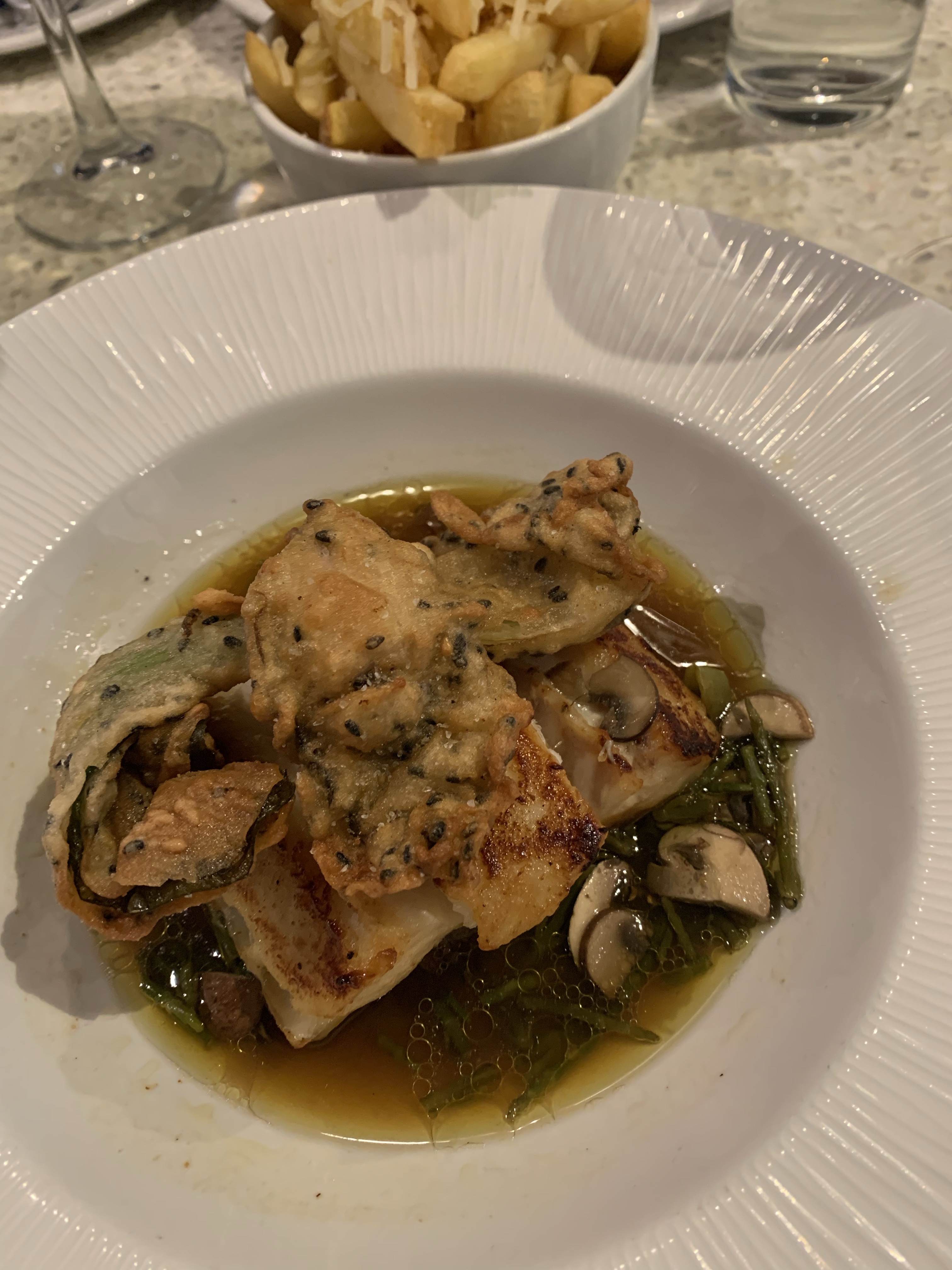 Starters consisted of mussels and crusty roll and crispy fried lobster cake. Mains came after a suitable point and this was miso glazed hake and Mourne seafood casserole.