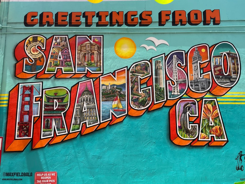 We headed further west, with no plan of where to go next. It was not for long as we came to Umbrella Alley, just off Beach Street. This amazing place has murals on the wall which are perfect for making great phot opportunities. There is also an umbrella and balloon ceiling in progress. The place is full of bright and colourful murals with different titles such as Summer of Love and California Dreaming. A recommended donation is $5 per visitor, which helps support the artists.