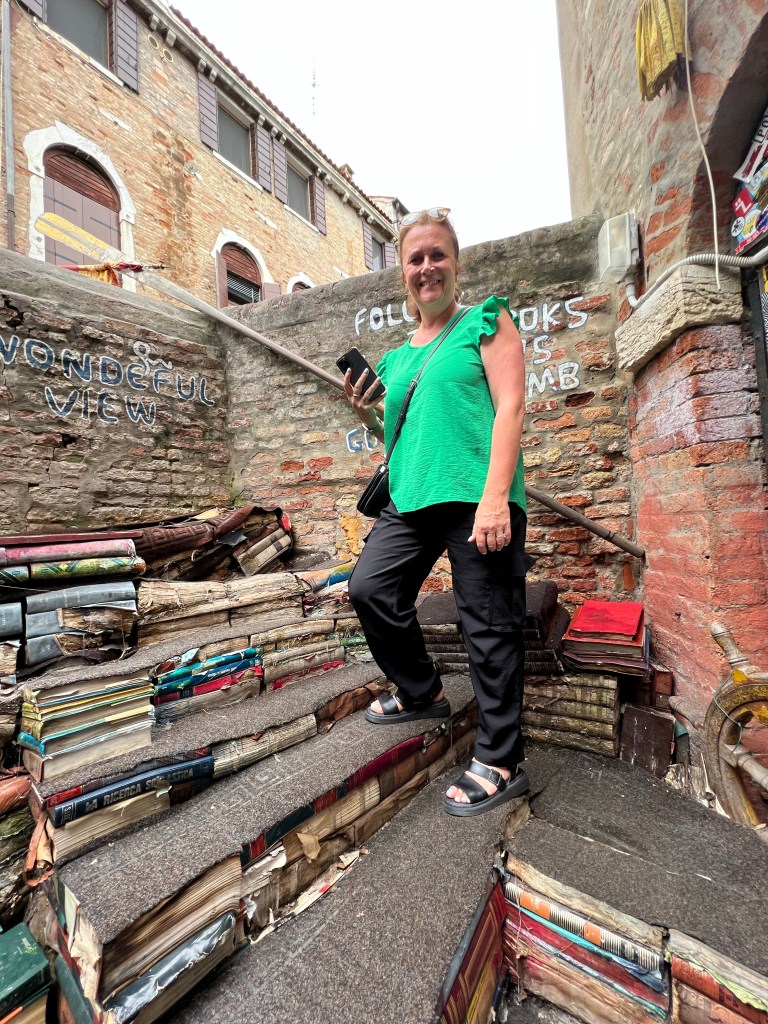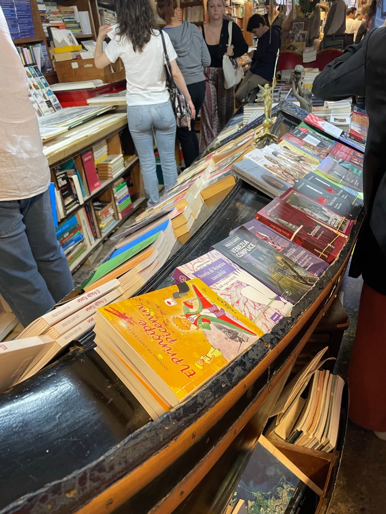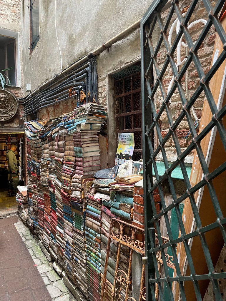The reason we needed to cross Piazza San Marco was to go to Libreria Acqua Alta, which is about an eight minute walk from there. Everyone was trying to get away from the water so it was really busy down the narrow alleyways. Located on Calle Lunga Santa Maria Formosa, Libreria Acqua Alta was also very busy. Outside there was a sign saying “Are you dogs owners? Our cats are pretty territorial so you’re kindly requested to hold them in your arms or wait outside here”. The stray cats are well known here but we didn’t see any.