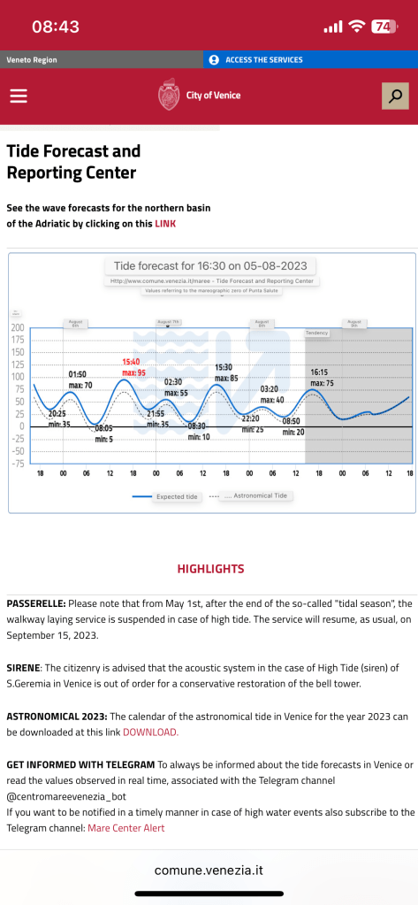 I was already aware of the term Acqua Alta (high water), which usually happens during spring and autumn in Venice, but can also occur at other times. I have since read a report by Meteo.it (Italian weather channel) that Piazza San Marco was flooded on the night of Tuesday 1st August to Wednesday 2nd August 2023. One metre of water was recorded there, which was a lot more than today.