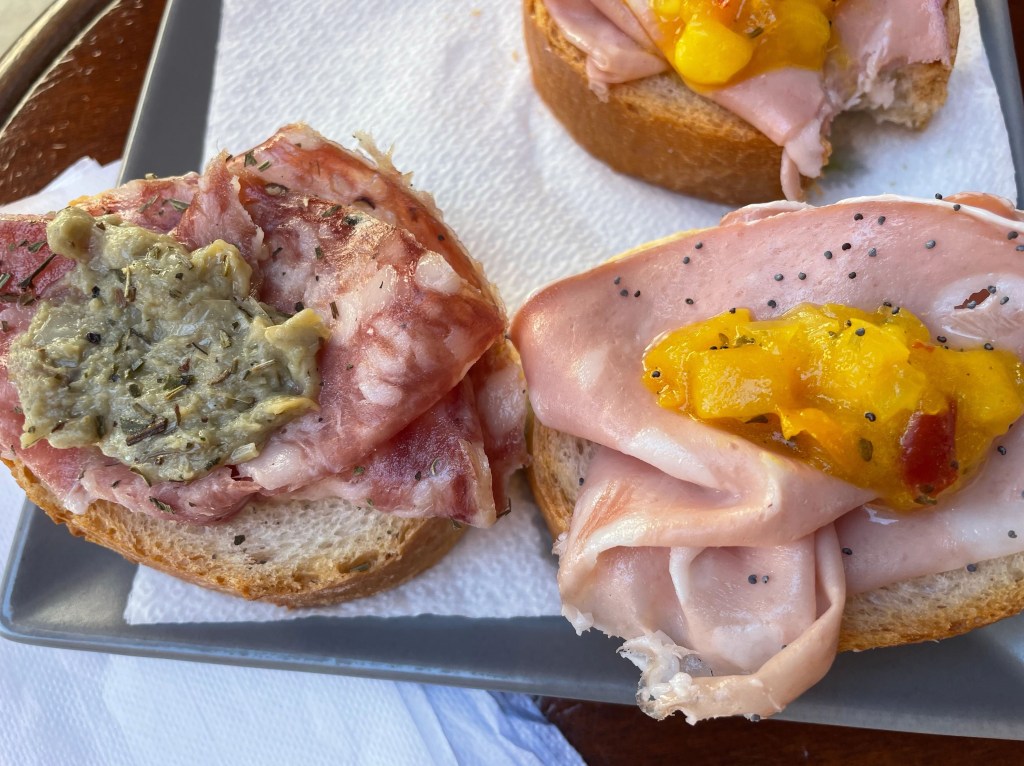 We had to check out of Hotel Paganelli by 11:00, so packed and left our bags downstairs. We weren’t particularly hungry but went for chichetti at a local cafe bar. There were plenty of choices but I went for mortadella with habanero which the server warned me about. It wasn’t that spicy, I was ok. JC went for salami topped with mushroom.