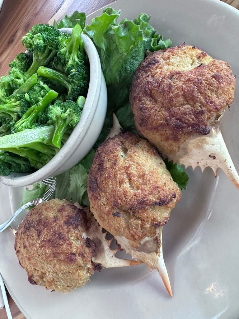 We went to CJ’s Crab Shack at 600 Ocean Drive, a stone’s throw from our hotel. It’s a place we’d been to during our last visit in 2023. The menu consists of mainly crab dishes with a few other fish and steak options. I went for the crab cake dinner. This was three smallish crab cakes served in their shell, with a cheese and breadcrumb topping. The crab was seasoned with a little spice which was perfect. I went for the veggie accompaniment which was basically a dish of broccoli topped with garlic butter.