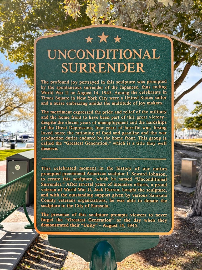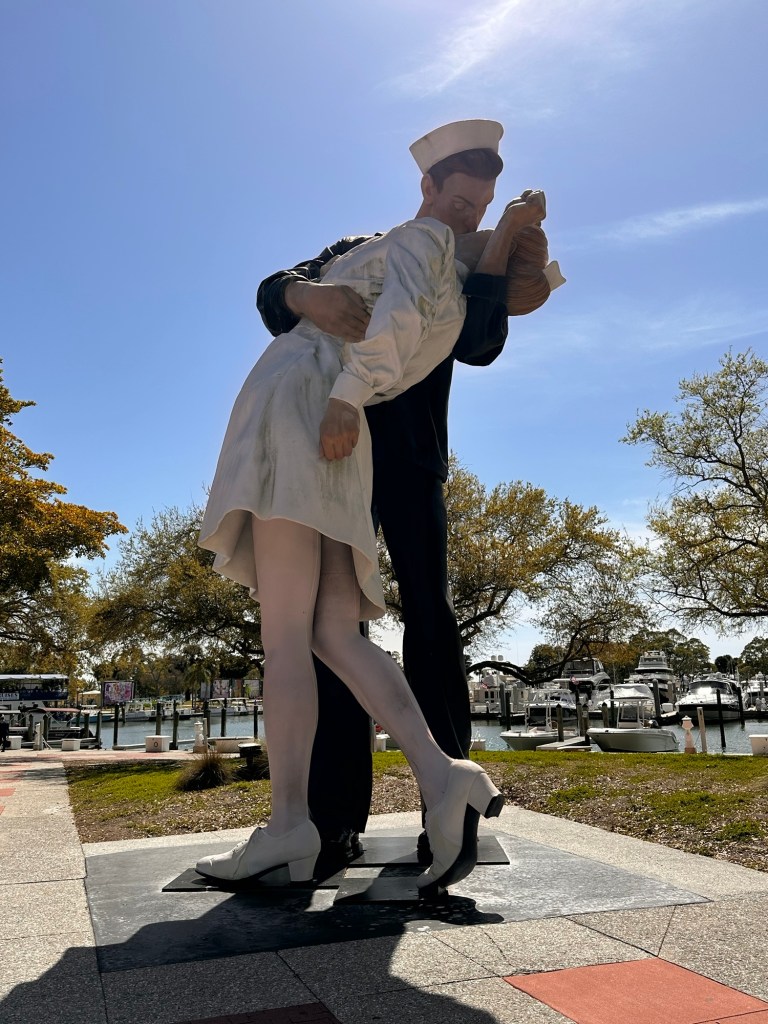 We headed back to the grassed and paved area, which I learned is called Unconditional Surrender Plaza. Here we saw the iconic statue officially entitled “The Unconditional Surrender” which was created by sculptor Seward Johnson. The inspiration came from the photograph of a sailor kissing a nurse in Times Square, New York, on 14th August 1945. This was following the surrendering of Japan that ended World War 2. There are replicas of this statue in other places in the world, such as Normandy in France. We have seen another replica when we visited San Diego in 2022.