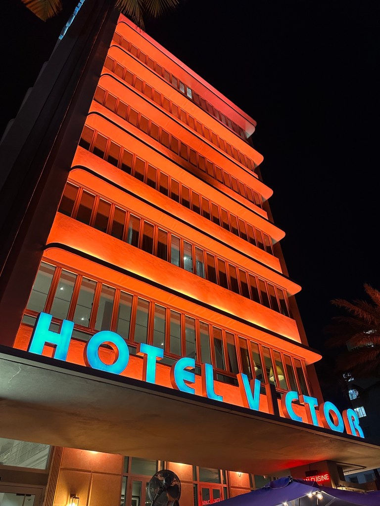 We got into Miami just before 2pm and dropped the car off. A quick Uber transported us to the Betsy Ross Hotel where we were able to check in early. The hotel is made up of the original Betsy hotel on Ocean Drive, and the Carlton hotel, which is directly behind it on Collins Avenue. Our room was in the Carlton hotel part of the establishment, which is accessible via a bridge from one building to the other. This bridge is called the Betsy Orb, seen from the outside as a giant white egg shaped structure. Inside it are art works mainly of the orb itself. At night it comes alive as it changes colour constantly. I was a little bit excited to discover that our room looked onto the orb itself, we had an up close view of it from our window!