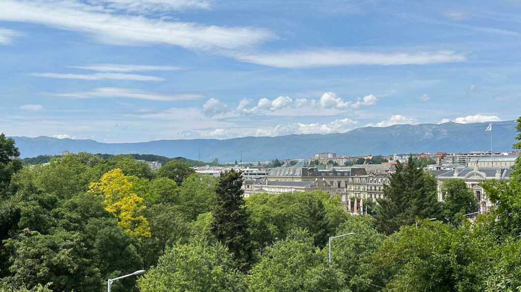 From there we went towards the Promenade de La Treille . This is a park, shaded by trees, and gives a panoramic view over part of Geneva. We sat on one of the longest benches in the world, watching the world go by. Built in 1767, it is 413 feet long.