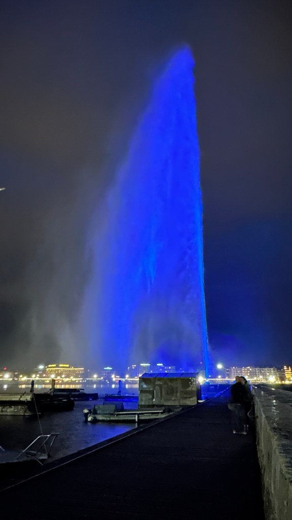 It was getting dark by 9:15 so we decided to walk to Lake Geneva and have a look at the Jet d’Eau at night. I’d read that it is lit up by coloured lights so I wanted to investigate (and burn off some of the million calories consumed today).