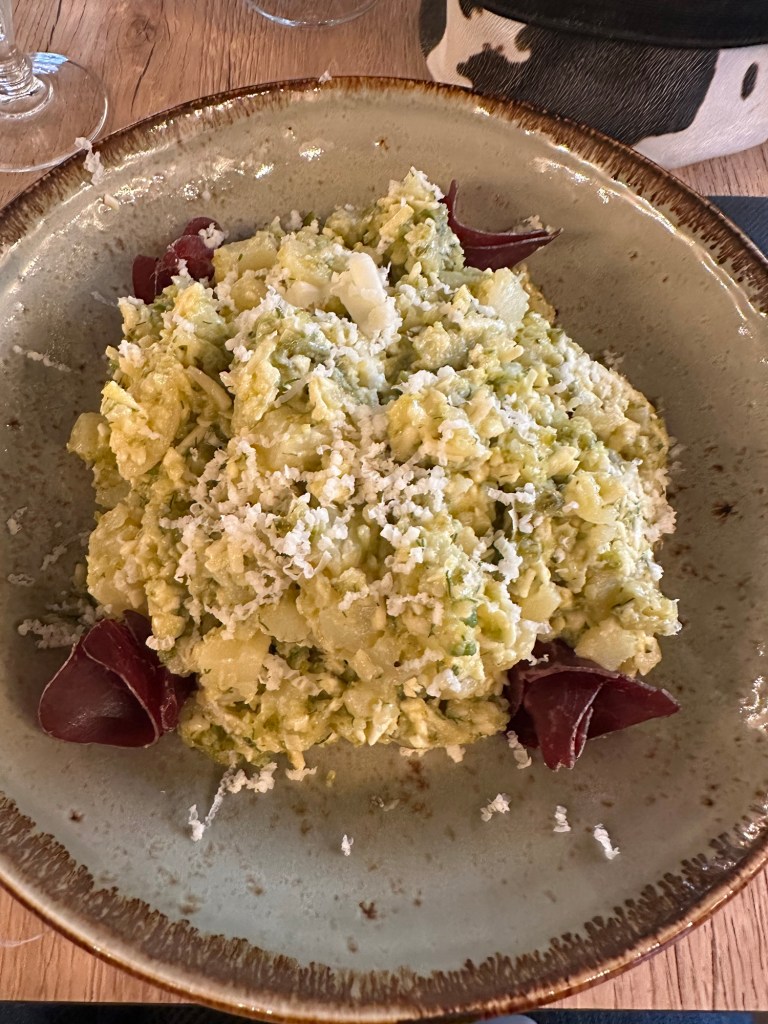 We left the lake behind as JC was getting hungry. There is no shortage of eateries here. We liked the look of the menu at Le Freti so we asked for a table. We opted for a Swiss salad accompanied by Apremont, a local white wine. The salad was described as “pommes de terre, oignons, pickles, shallots, dill, miel, olive oil, mustard, alpine gruyere aop, appenzeler, dried beef “tavaillon” grisons style. When it came it was a mixture of potato and cheese with rather sharp flavours of the pickles, shallots, honey and mustard. It went well with the local wine but best both of us, the portions were huge.
