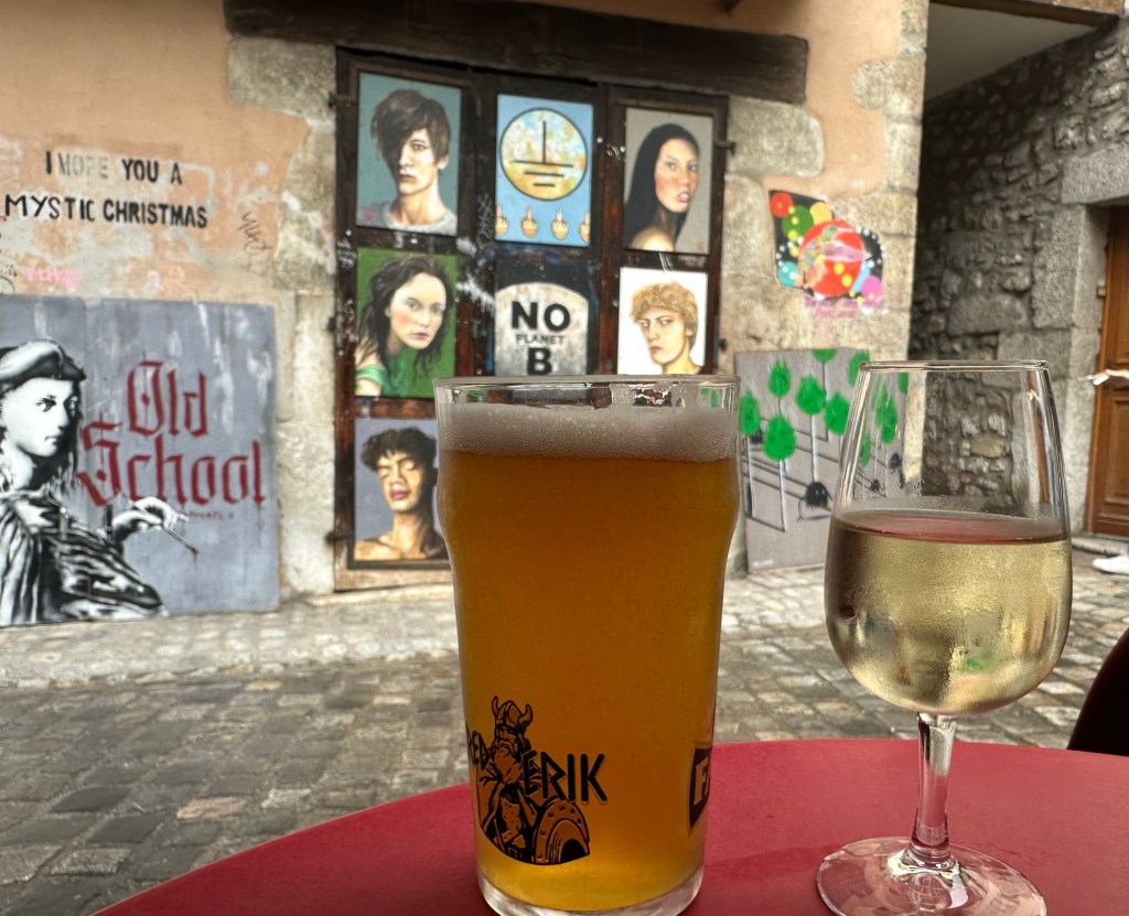 Around the Palais, lots of tiny midges were flying around, so we moved away quickly. They all seemed to be at the edge of Le Thiou. We then stumbled upon a really cool bar called Cafe des Arts, on the Passage de L’Île. This bar had quite a bohemian feel to it, with paintings on the wall opposite outside. The bar sold international and local beers, local wines and spirits. Staff were really friendly and helpful too.