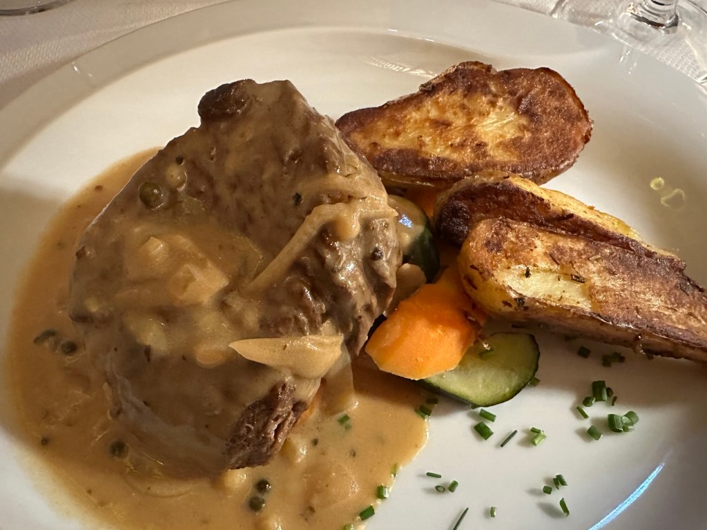Au Carnivore is situated on Rue de l’Hôtel de Ville. If looks small from the outside but is quite deceptive as it’s on more than one floor. There used to be also an outdoor area dining some steps. We chose to eat inside due to the inclement weather. The restaurant is typically French decor and had exactly what we wanted in the menu: fillet steak. We chose a local merlot to go with our steak so it was all perfect. We also had dessert (crème brûlée) which was delicious too.
