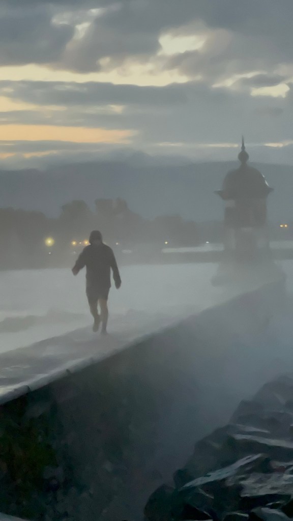 After eating we went back to the hotel for a quick drink and then headed out to the jet d’eau for a walk. We wanted to see if it had changed colour from last night’s blue. It had, it was a kind of pale red/pink colour. We could get quite close to it because of the wind direction but we weren’t crazy enough to walk through the mist to the jetty at the end.