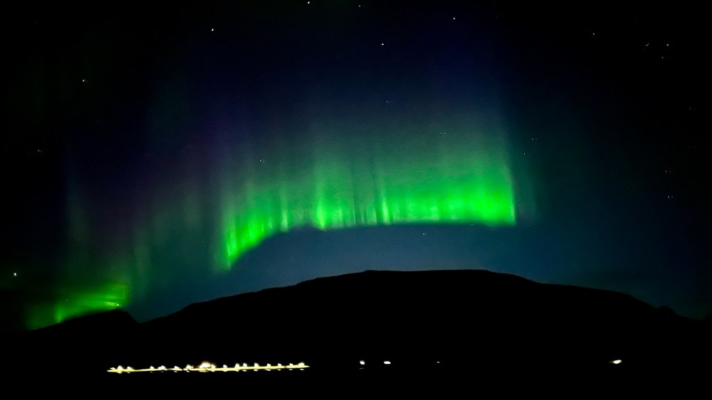 After our meal, we went up on the deck as it was getting dark and my Aurora app was telling me that there was activity over Northern Norway. It was amazing tonight, we did see the Aurora with our naked eye and early on before it was truly dark. It was quite weak to begin with, but soon was dancing in the night sky whilst we sailed through the fjords. It continued well into the night with a strong show at about 11:30pm. I decided to retire to bed at midnight, even though I could have carried on with the display, but we had a trip organised when we arrive at Honningsvåg, to the northernmost point in Europe – Nordkapp, the North Cape.