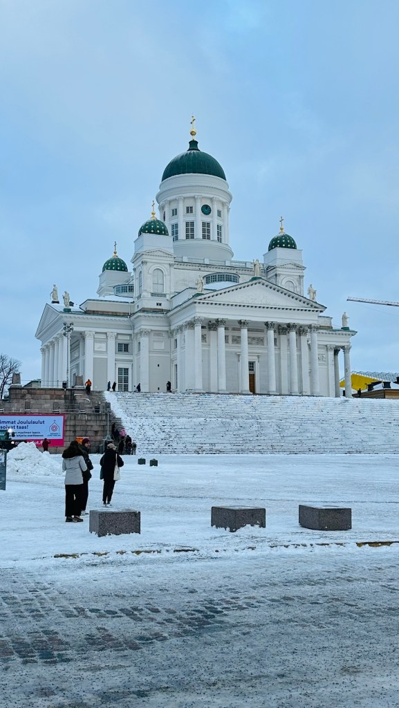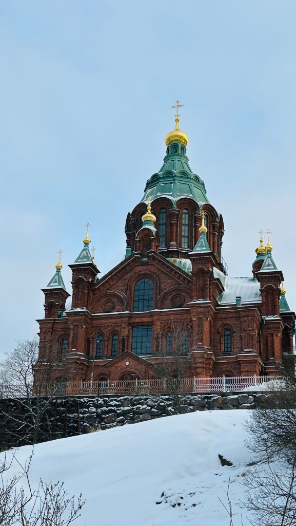 We were careful because of the compacted ice as we walked down to the Uspenski Cathedral, the Orthodox Church that we had seen on the first day that we arrived in Helsinki. It looked a little different with the blue sky too backdrop and snow on the domes. It looked lovely.