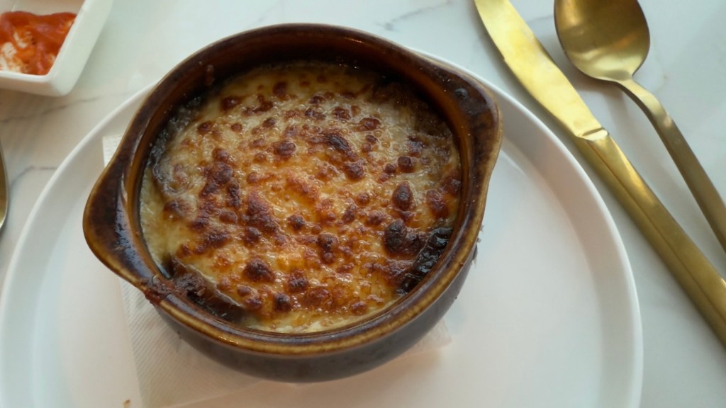 I decided to opt for French onion soup, followed by salmon for main. Jessie also wanted us to choose dessert and I went for chocolate tart, which was her recommendation. The French onion soup came which was ok. There wasn’t much soup as it was covered with a large layer of bread topped with cheese. The bread had soaked up quite a bit of the soup. I ate what I could and left some of the topping so I wasn’t full, and left some space for what was to come.