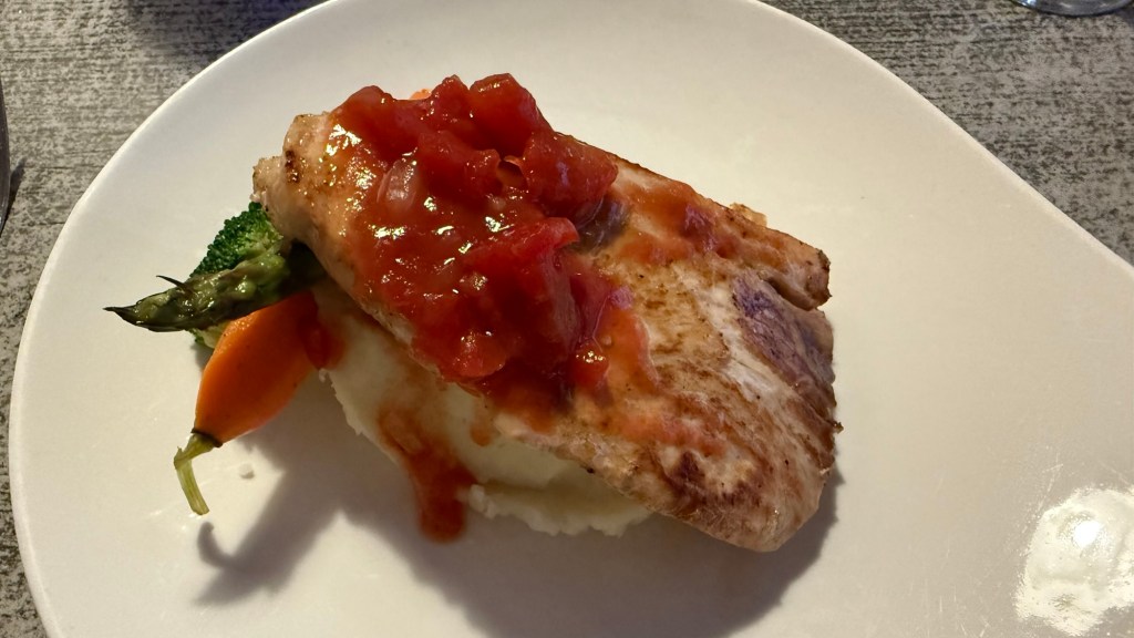 My main course was pan-seared swordfish, which came with an olive/onion/tomato salsa, whipped potato, carrot and avocado. That too was lovely.