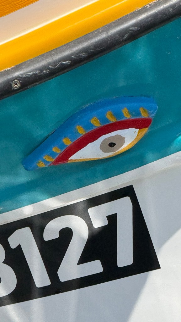 The taxi dropped us in the harbour area where we saw many luzzus, brightly painted with the eyes of Osiris on the bows — which are believed to protect fishermen.