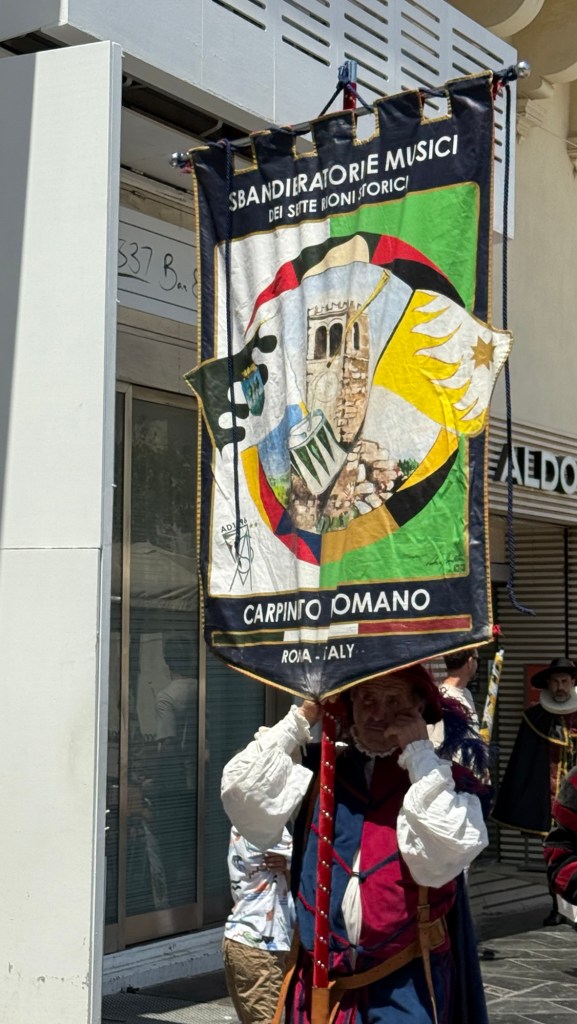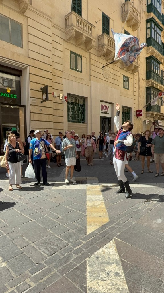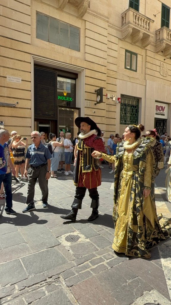 The first thing we saw was a small procession, with a lead man carrying a flag with the words “Sbandieratori E Musici dei Sette Rioni Storici Carpineto Romano”, which translates as “Flag-bearers and musicians of the seven districts” who hail from Rome, Italy. This is a folk group who participate in folk festivals but why they were in Malta is anyone’s guess. They were wearing heavy costumes which must have been uncomfortable in the heat.