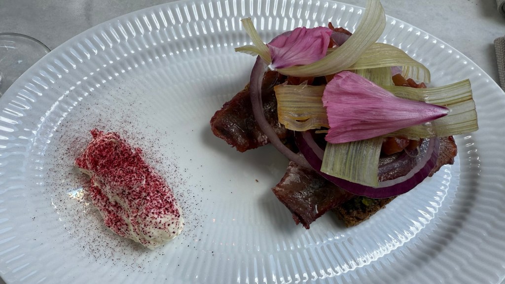 We wasted no time diving into a traditional smørrebrød Danish open sandwich lunch at Palægade Restaurant. According to our server, the Danish way is to start with herring — so I did, choosing red pickled herring with rhubarb, rose hip, crème fraîche and onion. Then came the steak of minced beef, cooked rare and topped with a classic garnish and egg yolk. Rustic, elegant, and very, very Danish. A great recommendation from our hotel receptionist.
