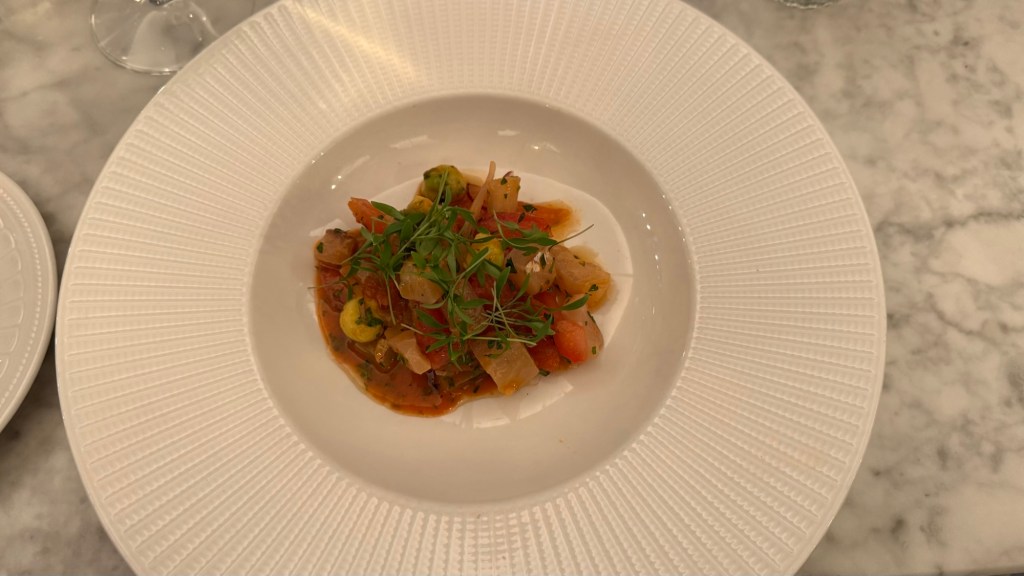 Starter: Ceviche of seabass with avocado, grapefruit, red onions, and chipotle.