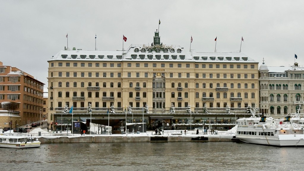 We passed Storkyrkan, Stockholm’s Cathedral – somewhere we still haven’t visited but always admire from the outside. Crossing Strömbron, we finally managed to capture a clear photo of The Grand Hotel, free from the heavy snowfall that had masked it on previous days.
