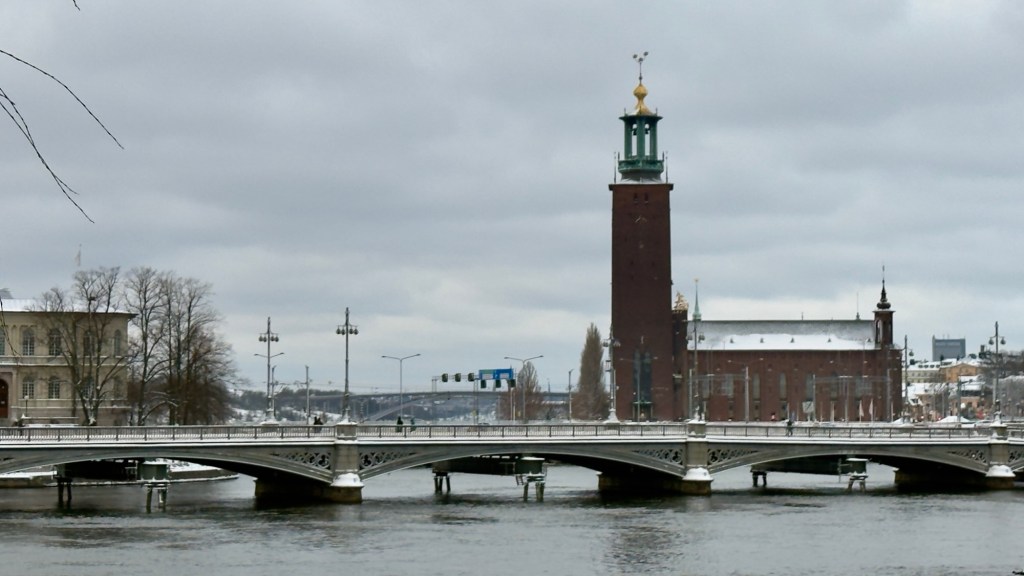 We walked through the arches at the back of the Parliament building and crossed Riksbron, managing to capture a much clearer view of Stadshuset (Stockholm City Hall) than before – no swirling snow this time.