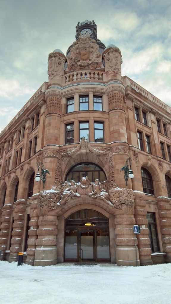 Built from red sandstone with rich sculptural and baroque-inspired details, it reflected the wealth and confidence of Stockholm’s banking world at the time. Over the years it has housed several banks, including Mälarbanken and Handelsbanken. Today, it forms part of the Swedish Government Offices, its impressive façade still telling the story of the city’s financial past.